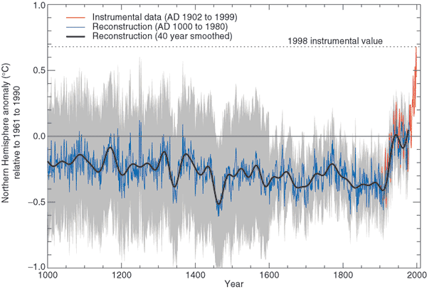 and historical records) and instrumental data (red) from AD 1000 to 1999. Smoother