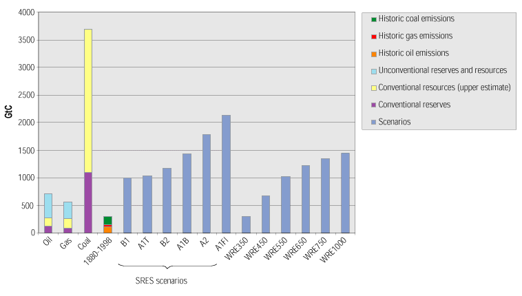 oil, gas and coal reserves and resources compared with historic fossil fuel carbon