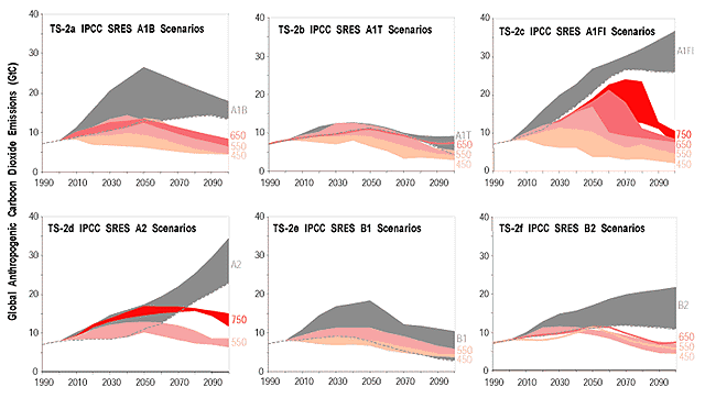 Scenarios (SRES). Each part of the figure shows the range of total global CO2