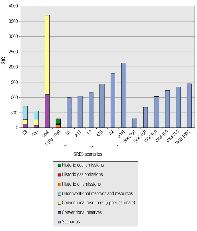 Figure TS.5: Carbon in oil, gas and coal reserves and resources compared with historic fossil fuel carbon emissions 1860-1998, and with cumulative carbon emissions from a range of SRES scenarios and TAR stabilization scenarios up until 2100. Data for reserves and resources are shown in the left hand columns. Unconventional oil and gas includes tar sands, shale oil, other heavy oil, coal bed methane, deep geopressured gas, gas in acquifers, etc. Gas hydrates (clathrates) that amount to an estimated 12,000 GtC are not shown. The scenario columns show both SRES reference scenarios as well as scenarios which lead to stabilization of CO2 concentrations at a range of levels. Note that if by 2100 cumulative emissions associated with SRES scenarios are equal to or smaller than those for stabilization scenarios, this does not imply that these scenarios equally lead to stabilization.
