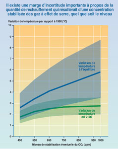 Il existe de multiples incertitudes pour ce qui est de la quantification du réchauffement qui résulterait de toute concentration stabilisée des émissions de gaz à effet de serre. Ceci est dû au facteur d’incertitude de trois concernant la sensibilité du climat aux augmentations des gaz à effet de serre4. La Figure RID–7 représente la stabilisation é ventuelle des niveaux de CO2 et la fourchette de variations de température correspondantes qui devraient être obtenues en 2100 et à la phase d’équilibre. |