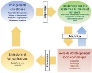 | Une vision globale des changements climatiques prend en compte les forces dynamiques en jeu dans le cycle de causes et effets interdépendants pour tous les secteurs concernés. La Figure 1-1 représente ce cycle, depuis les forces motrices sous-jacentes constituées par la population, l’économie, la technologie et la gouvernance, jusqu’aux émissions de gaz à effet de serre et autres émissions, à l’évolution du système climatique physique, aux incidences biophysiques et humaines, à l’adaptation et à l’atténuation, avant un retour aux forces motrices. La figure présente une vue schématique d’un cadre idéal « d’évaluation intégrée », dans lequel toutes les composantes du problème des changements climatiques sont en interaction. Des changements dans une partie du cycle influent sur les autres composants de façon dynamique, par des voies multiples. Le TRE évalue les nouvelles données et preuves pertinentes au point de vue politique pour tous les secteurs de la Figure 1-1. Un des nouveaux aspects du TRE a été de remplir la partie inférieure droite de la figure après étude d’autres voies de développement et de leurs liens avec les émissions de gaz à effet de serre, et recherches préliminaires sur l’interaction entre l’adaptation, l’atténuation et les voies de développement. Mais, en raison du caractère incomplet des connaissances, l’évaluation du TRE n’intègre pas la totalité des changements climatiques.