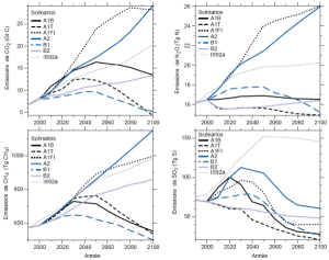 Les émissions anthropiques des trois principaux gaz à effet de serre (CO2, CH4 et N2O) ainsi que les émissions anthropiques de dioxyde de soufre correspondant aux six scénarios illustratifs du SRES sont indiquées à la figure TS 17. Il est clair que ces scénarios prennent en compte une large gamme d’émissions. A des fins de comparaison, les émissions correspondant au scénario IS92a sont également indiquées. Il est particulièrement intéressant de noter le niveau beaucoup plus faible des émissions futures de dioxyde de soufre selon les six scénarios du SRES par rapport aux scénarios IS92, en raison des changements structurels du système énergétique ainsi que des mesures prises pour lutter contre la pollution atmosphérique à l’échelon local et régional.