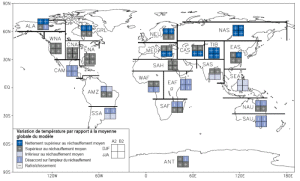 Les modèles prévoient certaines variations de plusieurs variables climatiques de grande échelle. Lorsque le forçage radiatif du système climatique change, les terres émergées se réchauffent plus vite et davantage que les océans, et il s’ensuit un réchauffement relativement plus marqué aux latitudes élevées. Les modèles prévoient une élévation inférieure à la moyenne mondiale de la température de l’air en surface dans l’Atlantique Nord et les zones océaniques circumpolaires de l’hémisphère Sud ainsi qu’une diminution de l’amplitude diurne de la température dans de nombreuses régions, les minima nocturnes augmentant davantage que les maxima diurnes. Un certain nombre de modèles font apparaître une diminution générale de la variabilité quotidienne de la température de l’air en surface en hiver et une augmentation de la variabilité quotidienne de cette température en été dans les zones continentales de l’hémisphère Nord. A mesure que le climat se réchauffe, les modèles prévoient un recul de la couverture neigeuse et de l’étendue des glaces de mer dans l’hémisphère Nord. Nombre de ces changements sont conformes aux observations récentes, comme il est indiqué dans la section B.