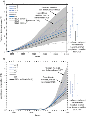 On utilise des ensembles multimodèles de simulations MCGAO fondées sur différents scénarios pour évaluer le changement moyen du climat et l’incertitude sur la base de la fourchette des résultats des modèles. Pour la fin du XXIe siècle (2071 à 2100), l’élévation moyenne de la température moyenne de l’air à la surface du globe, par rapport à la période 1961-1990, est de 3,0 °C (avec un intervalle de 1,3 à 4,5 °C) pour le projet de scénario de référence A2 et de 2,2 °C (avec un intervalle de 0,9 à 3,4 °C) pour le projet de scénario de référence B2. Le scénario B2 donne lieu à un réchauffement moins prononcé, ce qui est conforme à son taux d’accroissement plus faible de la concentration de CO2.