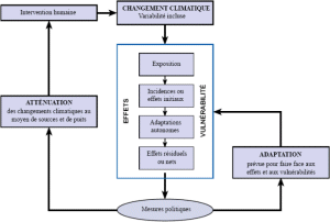 La Figure TS 1 présente l’objet de l’évaluation menée par le Groupe de travail II et ses liens avec les autres éléments liés aux changements climatiques. Les activités qui influent sur le climat exposent les systèmes naturels et humains à un jeu particulier de tensions ou de stimuli. Les systèmes qui y sont sensibles sont touchés par les changements, ce qui peut déclencher des modes d’adaptation autonomes ou prévus. L’adaptation autonome façonnera les effets nets ou résiduels des changements climatiques. Les mesures de parade face aux effets déjà perçus ou en prévision des effets futurs peuvent prendre la forme d’une adaptation prévue visant à réduire les effets néfastes ou à accroître les effets bénéfiques. Il peut aussi s’agir d’actions propres à atténuer les changements climatiques par la réduction des émissions des gaz à effet de serre et par la revalorisation des puits. L’évaluation a porté sur la partie centrale de la figure TS-1, soit l’exposition, les effets et la vulnérabilité, ainsi que sur la boucle de l’adaptation.