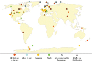 L’existence de multiples causes (par exemple changements d’affectation des terres, pollution) fait que l’attribution de nombreux effets observés des changements climatiques régionaux devient un défi complexe. Néanmoins, les études des systèmes soumis à des changements climatiques régionaux importants – dont on connaît la sensibilité – montrent des modifications conformes aux relations bien établies entre les processus climatiques et physiques ou biologiques (modification du bilan énergétique des glaciers et de l’aire de répartition des animaux et les plantes lorsque les températures dépassent les seuils physiologiques, par exemple) dans environ 80 pour cent des cas biologiques et 99 pour cent des cas physiques. Le tableau TS 16 présente environ 450 changements dans des processus ou chez des espèces, associés à des variations de la température régionale, tandis que la figure TS 11 illustre les lieux où ces études ont observé les incidences des variations. Ces cohérences renforcent notre confiance dans les liens établis entre les changements climatiques régionaux et ceux touchant les systèmes physiques et biologiques. Sur la base de ces observations, on peut affirmer avec un degré de confiance élevé que l’évolution du climat au XXe siècle a eu une incidence perceptible sur de nombreux systèmes physiques et biologiques. Les modifications des biotes et des systèmes physiques observées au cours du siècle dernier indiquent que ces systèmes sont sensibles à des changements climatiques modestes par rapport à ceux prévus pour le XXIe siècle. Les archives paléoclimatiques prouvent la grande sensibilité des systèmes biologiques aux changements climatiques à long terme. [ 19.2.2.]