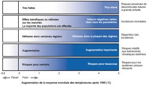 Certaines des connaissances actuelles sur les effets des changements climatiques, la vulnérabilité et l’adaptation sont résumées dans les pages suivantes par l’analyse de cinq sujets de préoccupation : les systèmes uniques et menacés, les effets généraux dans le monde, la distribution des effets, les phénomènes météorologiques extrêmes et les bouleversements à grande échelle. L’examen de ces sujets aide à mieux comprendre les vulnérabilités et les avantages potentiels associés aux changements climatiques causés par l’activité humaine, ce qui peut faciliter la réflexion des décideurs quant à ce qui pourrait constituer une interférence dangereuse avec le système climatique dans le cadre de l’article 2 de la CCNUCC. Aucune dimension n’est prépondérante.