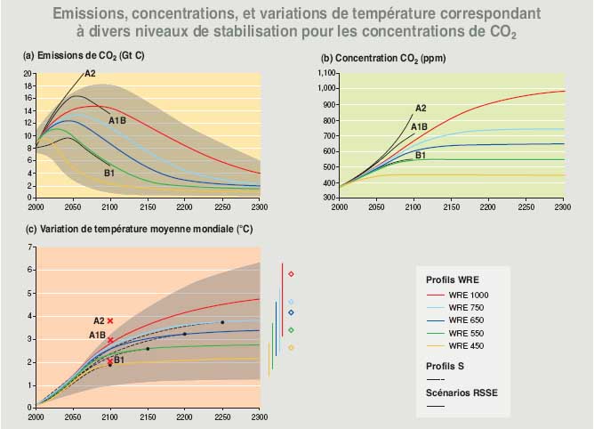 du CO2 à 450, 550, 650, 750 et 1 000 ppm sont estimés pour les profils de stabilisation