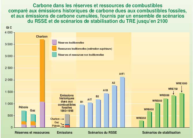 représentent 12 000 Gt C ne sont pas représentés. Les colonnes des scénarios indiquent