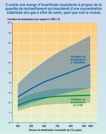 Figure RID–7: La stabilisation des concentrations de CO2 diminuerait le réchauffement, mais il est difficile de quantifier cette diminution avec certitude. Les variations de température par rapport à 1990 en (a) 2100 et (b) à l’équilibre sont estimées à l’aide d’un modèle climatique simple pour les profils WRE comme indiqué à la Figure RID–6. Les estimations minimales et maximales pour chaque niveau de stabilisation supposent une sensibilité du climat de 1,7 et 4,2 °C respectivement. L’axe est une moyenne des estimations minimales et maximales.
