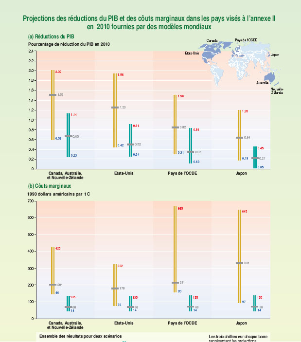 Figure RID–8 : Projections des réductions du PIB et des coûts marginaux dans les pays visés à l’Annexe II en 2010 fournies par des modèles mondiaux : (a) Réductions du PIB et (b) coûts marginaux. Les réductions du PIB prévues sont pour 2010 par rapport au PIB de référence des modèles. Ces estimations sont basées sur les résultats obtenus par neuf équipes de modélisation qui ont participé à une étude forum de modélisation sur l’énergie. Les projections illustrées concernent quatre régions qui constituent l’Annexe II. Les modèles ont examiné deux scénarios. Dans le premier, chaque région effectue la réduction prescrite avec uniquement des échanges domestiques des droits d’émissions de carbone. Dans le second, les échanges des droits d’émissions Annexe B sont autorisés et par conséquent, les coûts marginaux sont les mêmes pour toutes les régions. Pour chaque cas ou région, les valeurs maximales, moyennes et minimales des coûts marginaux estimés pour tous les modèles sont indiquées. Pour les facteurs clés, hypothèses et incertitudes sous-jacentes aux études, voir Tableau 7–3 et Encadré 7–1 dans le rapport principal.