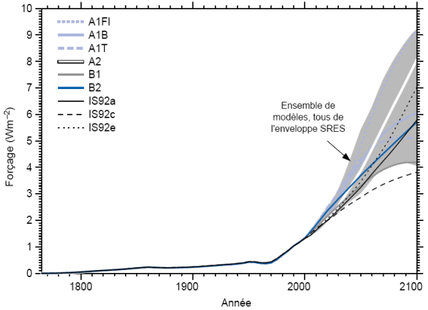 radiatif pour les six scénarios illustratifs du SRES. La zone grise représente