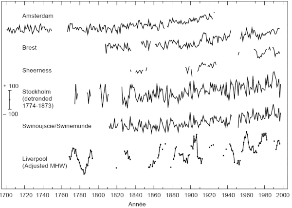 chronologique des niveaux relatifs de la mer durant les 300 dernières années