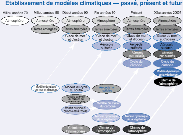 : Elaboration des modèles climatiques au cours des 25 dernières années, montrant comment les différentes composantes ont d’abord été modélisées séparément avant d’être couplées dans des modèles globaux.