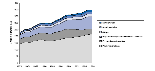 Consommation mondiale d’énergie primaire par région entre 1971 et 1998.