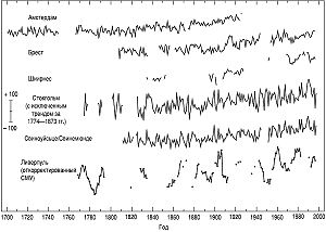 На основе данных, полученных с помощью мареографов, можно сделать вывод, что темпы повышения глобального среднего уровня моря в течение ХХ столетия находились в диапазоне от 1,0 до 2,0 мм/год; при этом центральное значение составило 1,5 мм/год (центральное значение не следует истолковывать как наилучшую оценку). (См. информацию о факторах, которые влияют на уровень моря, в текстовом блоке ТР-2). Как показано на рисунке ТР-6, самые продолжительные временные ряды приборных данных (самое большое за два или три столетия) о местном уровне моря получены от мареографов. На основе нескольких рядов зарегистрированных за продолжительный период данных мареографов можно сделать вывод, что средние темпы повышения уровня моря были в течение ХХ столетия больше, чем в течение XIX столетия. Никакого значительного ускорения темпов повышения уровня моря в течение ХХ столетия обнаружено не было. Такие результаты нельзя считать несовместимыми с результатами моделей, поскольку следует учитывать наличие компенсирующих факторов и ограниченность имеющихся данных.