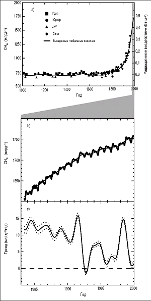 Концентрации метана (CH4) в атмосфере возросли в период с 1750 г. примерно на 150 % (1060 млрд-1). Современная концентрация CH4 является самой высокой за последние 420 000 лет. Метан (CH4) — это парниковый газ, высвобождаемый как из естественных (например заболоченные земли), так и антропогенных источников (например, сельское хозяйство, виды деятельности, связанной с природным газом и мусорные свалки). Несколько более половины современных выбросов CH4 имеют антропогенный характер. Метан удаляется из атмосферы в результате химических реакций. Как показано на рисунке ТР-11, систематические, представительные на глобальном уровне измерения концентрации CH4 в атмосфере проводятся с 1983 г., а данные о концентрациях в атмосфере в более ранние периоды были получены по результатам исследований воздуха, извлеченного из кернов льда и слоев фирна. Современное прямое радиационное воздействие в 0,48 Вт.м-2 от СН4 составляет 20 % от общего значения радиационного воздействия всех долго сохраняющихся и смешанных в глобальном масштабе парниковых газов (см. рисунок ТР-9).