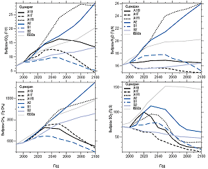 Антропогенные выбросы трех основных парниковых газов — CO2, CH4 и N2O , а также антропогенные выбросы двуокиси серы, показаны для шести иллюстративных сценариев СДСВ на рисунке ТР-17. Очевидно, что эти сценарии охватывают широкий диапазон выбросов. Для сравнения выбросы показаны также для IS92a. Особенно примечательным являются гораздо более низкие будущие выбросы двуокиси серы для шести сценариев СДСВ по сравнению со сценариями IS92 вследствие структурных изменений в энергетической системе, а также озабоченности в отношении загрязнения воздуха на местном и региональном уровнях.