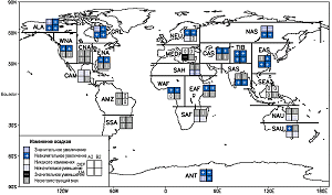 Сравнение изменений в наблюдаемых экстремальных явлениях погоды и климата с изменениями, прогнозируемыми при помощи моделей, проведено лишь недавно (таблица ТР-4). Почти во всех материковых районах будет наблюдаться, видно, большее количество жарких дней и волн тепла. Наибольшая величина этих увеличений прогнозируется главным образом в тех районах, в которых происходит уменьшение влажности почвы. Повышение дневных минимальных температур прогнозируется почти во всех материковых районах и, как правило, оно больше в тех местах, где происходит отступание снежного и ледяного покрова. Морозные дни и волны холода станут, вероятно, более редкими. Изменения приземной температуры воздуха и абсолютной влажности поверхности приведут, согласно оценкам, к повышению индекса тепла (который представляет собой показатель комбинированных эффектов температуры и влажности). Повышения приземной температуры воздуха также приведут, соглас но оценкам, к увеличению количества «градусо-дней теплого сезона» (что является показателем степени охлаждения, которое требуется в данный день, после того как температура превышает данное пороговое значение), а также уменьшению «градусо-дней отопления». Прогнозируется увеличение экстремальных величин осадков выше средних, а также повышение интенсивности осадков. Прогнозируется почти повсеместное повышение частоты экстремальных осадков. Прогнозируется общее осушение в среднеконтинентальных районах в летний период. Оно объясняется сочетанием более высокой температуры и потенциальной испаряемости, которая не уравновешивается повышением осадков. В то же время, модели характеризуются пока незначительной степенью согласованности между ними в том, что касается будущих изменений интенсивности штормов в средних широтах, их частоты и изменчивости. Мало последовательных доказательств, свидетельствующих об изменениях в прогнозируемой частоте тропических циклонов и районах их образования. В то же время, некоторые измерения интенсивности показывают возможное увеличение, а некоторые теоретические или модельные исследования свидетельствуют о том, что верхний предел этих интенсивностей может подняться. Средние и пиковые интенсивности осадков, вызванных тропическими циклонами, вероятно, увеличатся значительным образом.