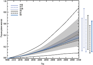 Для полного набора сценариев СДСВ в период 1990—2100 гг. прогнозируется подъем уровня моря в пределах 0,09—0,88 м (см. рисунок ТР-24), который объясняется главным образом тепловым расширением и потерей массы ледников и ледниковых куполов. Средняя величина составляет 0,48 м, что соответствует среднему показателю, превышающему почти в 2—4 раза показатель, наблюдаемый в ХХ веке. Диапазон подъема уровня моря, представленный в ВДО, составлял 0,13—0,94 м на основе сценариев IS92. Несмотря на содержащиеся в этой оценке прогнозы повышения температуры, перспективные оценки уровня моря являются несколько ниже, главным образом ввиду использования более совершенных моделей, которые в меньшей мере учитывают вклад со стороны ледников и ледовых щитов. Если наземное накопление будет продолжаться нынешними темпами, перспективные оценки могут измениться от -0,21 до 0,11 м. В среднем по МОЦАО сценарии СДСВ дают результаты, которые для первой половины XXI века отличаются на 0,2 м или меньше. К 2100 г. они меняются в пределе, составляющем порядка 50 % от средней величины. После XXI века подъем уровня моря в значительной степени зависит от сценария выбросов.