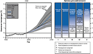 Свидетельствами уязвимости человеческого общества и естественных систем для экстремальных климатических явлений являются ущерб, трудности и смертные случаи, вызванные такими явлениями, как засухи, наводнения, волны тепла, снежные обвалы и ветровые штормы. Несмотря на наличие определенностей, связанных с оценками подобных изменений, прогнозируется увеличение частоты и/или суровости некоторых экстремальных явлений в течение ХХI века ввиду изменений усредненного климата и/или его изменчивости, вследствие чего можно ожидать, что суровость их последствий будет также увеличиваться сообразно глобальному потеплению (см. рисунок РП-2). Напротив, в будущем прогнозируется уменьшение частоты и масштабов явлений, связанных с крайне низкой температурой, таких, как холодные периоды, что будет иметь как позитивные, так и негативные последствия. Ожидается, что последствия будущих изменений в климатических экстремальных явлениях непропорциональным образом скажутся на неимущих слоях населения. Некоторые показательные примеры последствий в этих проектируемых изменениях в изменчивости климата и климатических экстремальных явлениях представлены в таблице РП-1. [3.5, 4.6, 6, и 7.2.4]