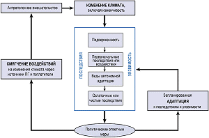 Чувствительность, адаптируемость и уязвимость, связанные с изменением климата Чувствительность — это та степень, в которой система является затронутой как негативным, так и благоприятным образом, в результате связанных с климатом воздействий. Эти воздействия охватывают в данном случае все элементы изменения климата, включая средние климатические характеристики, изменчивость климата, а также частоту и величину экстремальных явлений. Воздействия могут быть прямыми (например, изменение урожайности культур в результате изменения среднего значения, диапазона или изменчивости температур) или косвенными (например, ущерб, причиняемый в результате увеличения количества случаев наводнений в прибрежной зоне, вызванных подъемом уровня моря). Адаптационный потенциал — это способность системы приспосабливаться к изменению климата (включая изменчивость климата и его экстремальные явления), с тем чтобы смягчать потенциальный ущерб, использовать имеющиеся возможности или справляться с последствиями. Уязвимость — это та степень, в которой система подвержена негативным последствиям изменения климата и неспособна справляться с ними, включая изменчивость климата и его экстремальные явления. Уязвимость является функцией характера, величины и скорости климатических колебаний, которым подвергается данная система, ее чувствительности и адаптационного потенциала. |