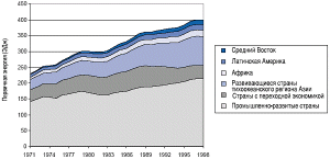 Рисунок ТP-3. Мировое использование первичной энергии по регионам в период с 1971 по 1998 гг. |