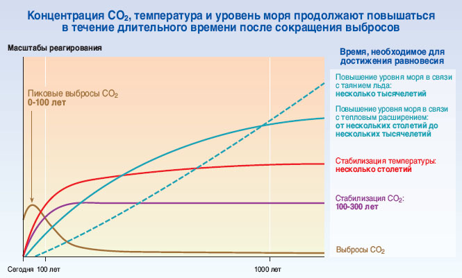 времени после сокращения выбросов СО2, а таяние ледяных покровов будет