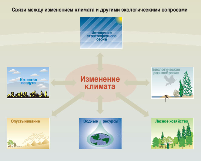 На схеме показаны некоторые из этих вопросов. Для простоты одинарными стрелками с двумя указателями между вопросами показаны некоторые действующие связи. Например, биологические и экологические процессы играют важную роль в формировании климата Земли как на региональном, так и на глобальном уровне посредством регулирования концентрации водяных паров и других парниковых газов, содержание которых в атмосфере увеличивается или сокращается. Изменение климата воздействует на границы, состав и функционирование таких экологических систем, как леса, а изменение структуры и жизнедеятельности лесов влияет на климатическую систему Земли посредством изменения биохимических циклов, в частности круговорота углерода, азота и воды. Существуют и другие связи, такие, как взаимодействие между качеством воздуха и лесами, непосредственные или косвенные кислотные осаждения, которые для упрощения здесь не показаны.