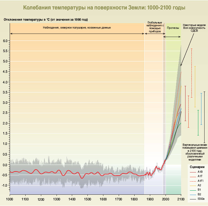 на поверхности Земли: 1000-2100 годы. На рисунке показаны колебания средней