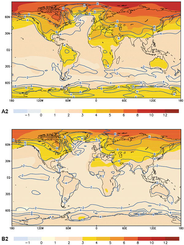 scenario B2 (lower panel). Both SRES scenarios show