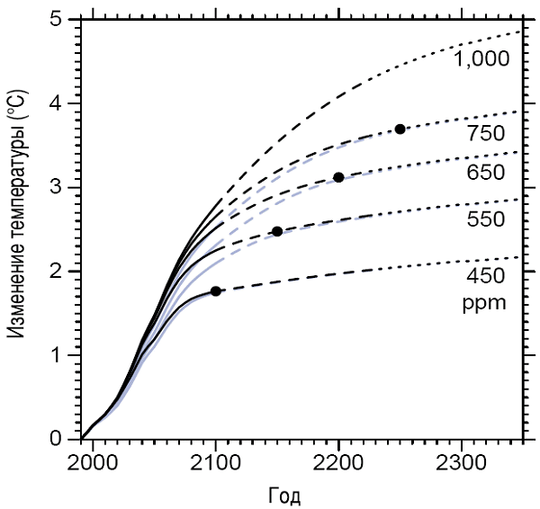 2100. The black dots indicate the time of CO2 stabilisation. The stabilisation