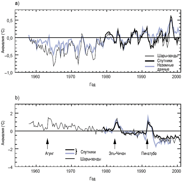 с шаров-зондов и со спутников в дополнение к наземным данным. (b) Временные ряды аномальных значений сезонной температуры нижнего слоя