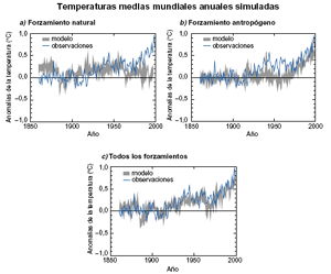 Un modelo climático puede utilizarse para simular los cambios de temperatura que se producen por causas naturales y antropógenas. Las simulaciones que representa la banda en a) se hicieron sólo con forzamientos naturales (variación solar y actividad volcánica). Las simulaciones de la banda en b) se hicieron con forzamientos antropógenos (gases de efecto invernadero (GEI) y una estimación de los aerosoles de sulfatos) y las simulaciones que recoge la banda en c) se efectuaron con forzamientos naturales y antropógenos. En b) puede verse que la inclusión de forzamientos antropógenos proporciona una explicación verosímil de una parte importante de los cambiosde temperatura observados en el último siglo, pero la mejor correspondencia con las observaciones se logra en c), al incluir tanto los factores naturales como los antropógenos. Estos resultados muestran que los forzamientos incluidos son suficientes para explicar los cambios observados, pero no excluyen la posibilidad de que hayan intervenido también otros forzamientos. Las bandas de los resultados de los modelos que se presentan aquí corresponden a cuatro ejecuciones del mismo modelo. En otros modelos con forzamiento antropógeno se logran resultados similares a los de b). [Basado en el capítulo 12, Figura 12.7] |