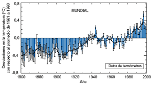 La temperatura media mundial en la superficie ha aumentado 0,6 ± 0,2°C3 desde fines del siglo XIX. Es muy probable que los años noventa hayan sido el decenio más cálido y 1998 el año más cálido, según los registros instrumentales, desde 1861 (véase la Figura 2). La causa principal del aumento estimado del calentamiento mundial, de 0,15°C desde el SIE, está vinculada con el récord de calor de los seis años de datos adicionales (1995 a 2000). Una segunda razón se relaciona con los mejores métodos para calcular el cambio. El actual margen de incertidumbre, levemente superior (±0,2°C, intervalo de confianza del 95%) también tiene fundamentos más objetivos. Además, la base científica para confiar en los cálculos del aumento de la temperatura mundial desde fines del siglo XIX se ha visto fortalecida desde el SIE. Esto se debe a las mejoras derivadas de varios nuevos estudios. Entre ellos figura una prueba independiente de las correcciones empleadas para las desviaciones dependientes del tiempo en los datos sobre la temperatura en la superficie del mar y nuevos análisis acerca del efecto de las “islas de calor” urbanas sobre las tendencias mundiales en la temperatura en tierra. Como se indica en la Figura 2, la mayor parte del aumento de la temperatura mundial desde fines del siglo XIX se ha producido en dos períodos distintos: 1910 a 1945 y a partir de 1976. El ritmo de aumento de la temperatura para ambos períodos es de unos 0,15°C/decenio. El calentamiento reciente ha sido mayor en tierra que en los océanos; el aumento de la temperatura en la superficie del mar durante el período 1950–1993 es aproximadamente la mitad del experimentado por la temperatura media del aire en la superficie del suelo. La elevada temperatura mundial asociada con el fenómeno El Niño de 1997 a 1998 se destaca como un fenómeno extremo, aun tomando en cuenta el ritmo reciente de calentamiento.