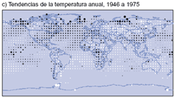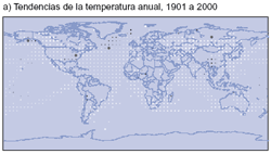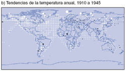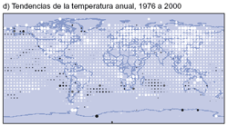 La pautas regionales del calentamiento que se produjo en la primera parte del siglo XX fueron diferentes de las que se presentaron en la última parte del mismo siglo. En la Figura 3 se muestran las pautas regionales del calentamiento que se ha producido a lo largo de todo el siglo XX, así como tres períodos componentes temporales. El período más reciente de calentamiento (1976 a 1999) ha sido casi mundial, pero los mayores aumentos de temperatura se produjeron en las latitudes altas y medias de los continentes del hemisferio norte. El enfriamiento durante todo el año es evidente en el noroeste del océano Atlántico Norte y en el centro del Pacífico Norte, pero recientemente se ha invertido la tendencia refrigerante del Atlántico Norte. Se ha demostrado que las pautas regionales recientes del cambio de temperatura se vinculan, en parte, con diversas etapas de las oscilaciones atmosférico-oceánicas, como la Oscilación del Atlántico Norte-Ártica y posiblemente la Oscilación decenal del Pacífico. Por lo tanto, las tendencias de la temperatura regional a través de unos pocos decenios pueden verse fuertemente influidas por la variabilidad regional en el sistema climático y pueden apartarse apreciablemente del promedio mundial. El calentamiento de 1910 a 1945 estuvo concentrado inicialmente en el Atlántico Norte. En cambio, el período de 1946 a 1975 mostró un importante enfriamiento en el Atlántico Norte, así como en gran parte del hemisferio norte, y un calentamiento en gran parte del hemisferio sur.