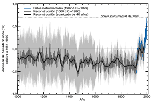 ![]() Figura 5: Reconstrucción de la temperatura del hemisferio norte (HN) en el milenio (gris oscuro – anillos de crecimiento de árboles, corales, muestras de hielo y registros históricos) y datos instrumentales (azul) desde 1000 d.C hasta 1999. Se muestran una versión suavizada de la serie HN (negro) y dos límites de error tabular (gris claro). [Basado en la Figura 2.20] |
