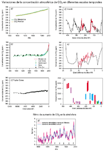 La concentración de CO2 en la atmósfera ha aumentado de 280 ppm5 en 1750 a 367 ppm en 1999 (31%, Cuadro 1). La concentración actual de CO2 no ha sido superada en los últimos 420.000 años y probablemente tampoco en los últimos 20 millones de años. La tasa de aumento en el siglo pasado no tiene precedentes, por lo menos durante los últimos 20.000 años (Figura 10). La composición isotópica del CO2 y la disminución observada en el oxígeno (O2) demuestran que el aumento observado en CO2 se debe predominantemente a la oxidación de carbono orgánico por la quema de combustibles de origen fósil y la deforestación. Un conjunto creciente de datos paleoatmosféricos obtenidos en aire atrapado en el hielo durante centenares de milenios ofrece un contexto para el aumento en las concentraciones de CO2 durante la Era Industrial (Figura 10). Comparado con las concentraciones relativamente estables de CO2 (280 ± 10 ppm) de los varios milenios precedentes, el aumento durante la Era Industrial es espectacular. El ritmo medio de aumento desde 1980 es de 0,4%/año. El aumento es consecuencia de las emisiones de CO2. La mayoría de las emisiones durante los últimos 20 años se deben a la quema de combustibles de origen fósil; el resto (del 10 al 30%) se debe predominantemente a los cambios en el uso de la tierra, especialmente por la deforestación. Como se muestra en la Figura 9, el CO2 es el gas dominante de efecto invernadero por influencia humana, con un forzamiento radiativo actual de 1,46 Wm-2, que representa el 60% del total de los cambios en las concentraciones de todos los GEI muy resistentes mezclados de forma homogénea en todo el planeta.