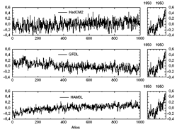 De acuerdo con las estimaciones de los modelos actuales, es muy improbable que el calentamiento registrado en los últimos 100 años se deba exclusivamente a la variabilidad interna. El registro instrumental data de épocas recientes y abarca el período de influencia humana y los registros paleoclimáticos incluyen variaciones forzadas de forma natural, como las debidas a los cambios en la irradiancia solar y la frecuencia de erupciones volcánicas de gran magnitud. Estas limitaciones dejan pocas alternativas, aparte del uso de simulaciones con modelos acoplados, para estimar la variabilidad climática interna. Desde el SIE se han utilizado más modelos para estimar la magnitud de la variabilidad climática interna, y en la Figura 14 se da un ejemplo representativo de ello. Como puede verse, la variabilidad interna a escala mundial muestra un amplio margen de variación en esos modelos. Las estimaciones de la variabilidad a escalas temporales más prolongadas que tienen importancia para los estudios de detección y atribución son inciertas, pero a escalas temporales interanuales y decenales algunos modelos muestran una variabilidad similar o mayor que la observada, aunque los modelos no incluyen una varianza de las fuentes externas. Las conclusiones sobre la detección de una señal antropógena son independientes del modelo utilizado para estimar la variabilidad interna, y los cambios recientes no pueden atribuirse a una variabilidad puramente interna, aun cuando la amplitud de las variaciones internas simuladas se multiplique por dos o por un factor quizás mayor. Los estudios más recientes de detección y atribución no han encontrado pruebas de que la variabilidad interna en la superficie estimada por los modelos sea incongruente con la variabilidad residual que queda en las observaciones después de eliminar las señales antropógenas estimadas en las escalas espaciales y temporales amplias utilizadas en los estudios de detección y atribución. Sin embargo, debe tenerse presente que la capacidad para detectar incongruencias es limitada. Como se indica en la Figura 14, ninguna simulación de control realizada por un modelo muestra una tendencia en la temperatura del aire en la superficie tan marcada como la tendencia observada en los últimos 1.000 años.