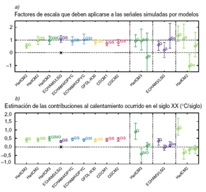 La mayoría de los estudios de atribución han llegado a la conclusión de que, en los últimos 50 años, la velocidad y la magnitud estimadas del calentamiento de la Tierra causado únicamente por el aumento de la concentración de los gases de efecto invernadero son similares o superiores a la velocidad y la magnitud del calentamiento observado. Los estudios de atribución tratan de resolver la cuestión de “si la magnitud de la respuesta simulada a un determinado forzamiento concuerda con las observaciones”. El uso de técnicas de señales múltiples ha permitido hacer estudios que pueden diferenciar los efectos de distintos factores sobre el clima. La inclusión de la dependencia temporal de las señales ha ayudado a distinguir los forzamientos naturales de los antropógenos. A medida que se van incluyendo tipos diferentes de respuestas, se plantea inevitablemente el problema de la degeneración (distintas combinaciones de características que dan resultados casi idénticos a las observaciones). Sin embargo, aunque se incluyan en el análisis todas las respuestas más importantes, los GEI siguen emitiendo una señal clara y perceptible. Por otra parte, la mayoría de las estimaciones de los modelos que tienen en cuenta tanto los GEI como los aerosoles de sulfatos concuerdan con las observaciones correspondientes a ese período. La máxima concordancia entre las simulaciones de los modelos y las observaciones de los últimos 140 años se produce cuando se incluyen tanto los factores antropógenos como los naturales (véase la Figura 15). Estos resultados indican que los forzamientos incluidos son suficientes para explicar los cambios observados, pero no excluye la posibilidad de que hayan contribuido además otros forzamientos. En términos generales, la magnitud de la respuesta de la temperatura al aumento de las concentraciones de los GEI es congruente con las observaciones en las escalas consideradas (véase la Figura 16), pero sigue habiendo discrepancias entre la respuesta que muestran los modelos y la respuesta observada ante otros factores naturales y antropógenos.