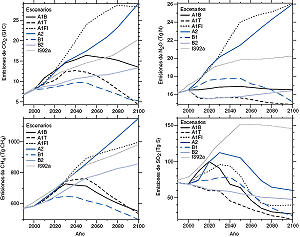 En la Figura 17 pueden verse las emisiones antropógenas de los tres GEI más importantes ––CO2, CH4 y N2O––, junto con las emisiones antropógenas de dióxido de azufre, en los seis escenarios ilustrativos del IE-EE. Es evidente que estos escenarios abarcan una amplia gama de emisiones. También se indican, con fines de comparación, las emisiones del escenario IS92a. Cabe destacar en particular que el nivel de las emisiones de dióxido de azufre en los seis escenarios del IE-EE es muy inferior al nivel de los escenarios IS92, debido a cambios estructurales en el sistema de energía y a la preocupación por la contaminación del aire en el ámbito local y regional.