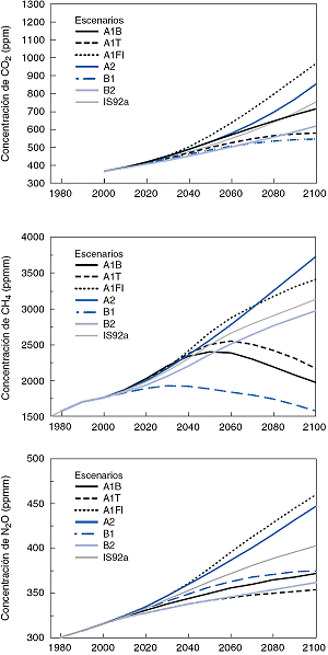 Los cálculos que hacen los modelos de la concentración de gases de efecto invernadero primarios distintos del CO2 para el año 2100 varían considerablemente entre los seis escenarios ilustrativos del IE-EE. En general, los escenarios A1B, A1T y B1 muestran los incrementos menores, mientras que los escenarios A1FI y A2 registran los mayores aumentos. Los cambios en la concentración de CH4 entre 1998 y 2100 oscilan entre –90 y +1970 ppmm (–11% a +112%), y los aumentos de N2O varían de +38 a +144 ppmm (+12% a +46%) (véanse las Figuras 17b y c). Los HFC (134a, 143a y 125) alcanzan concentraciones que van de unos pocos cientos a unos miles de ppb, a diferencia de los niveles insignificantes de hoy en día. Se proyecta que el PFC CF4 aumentará hasta alcanzar valores de entre 200 y 400 ppb, y que el SF6 aumentará hasta llegar a un nivel de entre 35 y 65 ppb.