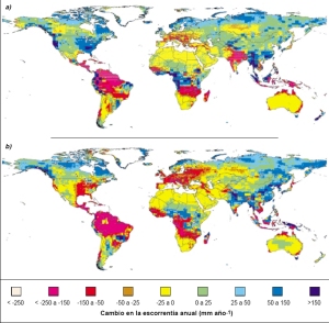 La magnitud y la frecuencia de las inundaciones podrían aumentar en muchas regiones como consecuencia de una creciente ocurrencia de sucesos de precipitación fuerte que pueden también hacer que aumentar las escorrentías en la mayor parte de las zonas así como la recarga de aguas subterráneas en algunas llanuras para alimentos. El cambio en la utilización de los terrenos puede agudizar tales sucesos. Disminuiría en muchas zonas el flujo superficial de corrientes durante períodos de circulación baja estacional debido a una mayor evaporación; los cambios de precipitación pueden agudizar o desplazar los efectos de un aumento de la evaporación. El cambio climático previsto deterioraría la calidad de las aguas por temperaturas mayores del agua y por una mayor carga de contaminantes de escorrentías e inundaciones procedentes de instalaciones para desechos. La calidad del agua se degradaría aún más cuando disminuyera la circulación de agua, pero si aumentara la circulación podrían mitigarse hasta cierto punto algunos deterioros de la calidad del agua al aumentar la disolución. En los lugares donde las nevadas son en la actualidad un componente importante del equilibrio hídrico, una mayor proporción de precipitaciones en invierno puede convertirse en lluvia y esto podría llevar a un flujo de corrientes de máxima intensidad que se desplazaría de la primavera al invierno. [4.1]