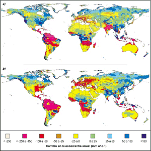 ![]() Figura RT-3: Las configuraciones de los cambios en la escorrentía se parecen mucho a los cambios simulados en la precipitación, los cuales varían entre los modelos climáticos. Los aumentos de la escorrentía en latitudes altas y Asia sudoriental, y las disminuciones en Asia central, la zona alrededor del Mediterráneo, África meridional y Australia que se muestran en ambos mapas del modelo [a) HadCM2 media del conjunto de integraciones en abanico y b) HadCM3; véase en la sección 4.3.6.2 del Capítulo 4 un examen de los modelos y escenarios utilizados] son en general consistentes, en términos de dirección del cambio, en la mayoría de los modelos climáticos. En otras partes del mundo, los cambios en la precipitación y la escorrentía varían entre los escenarios de cambio climático. |