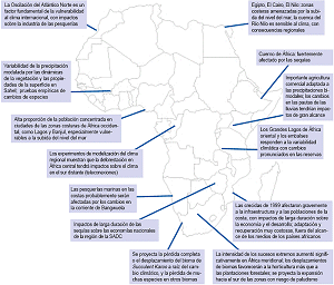 África es sumamente vulnerable al cambio climático. Los impactos de particular interés para África tienen que ver con los recursos de agua, la producción de alimentos, la salud humana, la desertificación y las zonas costeras, especialmente en relación con los sucesos extremos. La sinergia entre el uso de la tierra y el cambio climático exacerbará la desertificación. En la Figura RT-6 se destacan algunos de los impactos principales en África.