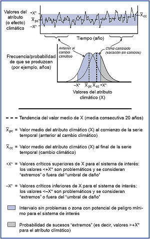 Las características del cambio climático más importantes para la vulnerabilidad y la adaptación tienen que ver con la variabilidad y los extremos, y no simplemente con las nuevas condiciones medias (Figura RT-10). Las sociedades y las economías se han venido adaptando al clima desde hace siglos. La mayoría de los sectores, regiones y comunidades tienen una capacidad de adaptación razonable a los cambios en las condiciones medias, particularmente si los cambios son graduales. No obstante, las pérdidas provocadas por las variaciones y los extremos climáticos son sustanciales, y en algunos sectores están aumentando. Estas pérdidas indican que la adaptación autónoma no ha sido suficiente para contrarrestar los daños relacionados con las variaciones temporales en las condiciones climáticas. Las comunidades, por lo tanto, son más vulnerables y menos adaptables a los cambios en frecuencia y magnitud de las condiciones distintas de las medias, especialmente los extremos, que son inherentes al cambio climático. El grado en que las futuras adaptaciones logren contrarrestar los impactos adversos del cambio climático dependerá del éxito de la adaptación a ese cambio, su variabilidad y sus extremos. [18.2.2]