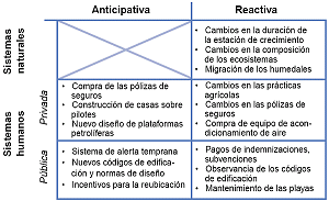 La adaptación al cambio climático brinda la posibilidad de reducir en forma sostenible muchos de los impactos adversos de ese cambio y aumentar los impactos beneficiosos , aunque ambos tienen su costo y dejan daños residuales. En los sistemas naturales, la adaptación se produce por reacción, mientras que en los sistemas humanos puede también ser previsora. En la Figura RT-9 se presentan tipos y ejemplos de adaptación al cambio climático. La experiencia en materia de adaptación a la variabilidad y los extremos climáticos muestra que en los sectores privado y público hay limitaciones a la realización del potencial de adaptación. La adopción y la eficacia de la adaptación privada, o impulsada por el mercado, en sectores y regiones está limitada por otras fuerzas, condiciones institucionales y diversas fuentes de fallos del mercado. Hay pocas pruebas de que las adaptaciones privadas se utilizarán para compensar los daños del cambio climático a los ambientes naturales. En algunos casos, las medidas de adaptación podrían tener consecuencias imprevistas, incluido el daño al medio ambiente. Los costos ecológicos, sociales y económicos de depender de una adaptación autónoma de reacción a los efectos acumulativos del cambio climático son sustanciales. Muchos de estos costos pueden evitarse mediante una adaptación previsora y planeada. Con un diseño apropiado, muchas estrategias de adaptación pueden proporcionar beneficios múltiples a medio plazo y a más largo plazo. No obstante, hay límites a su aplicación y eficacia. El mejoramiento de la capacidad de adaptación reduce la vulnerabilidad de sectores y regiones al cambio climático, incluidos los extremos y la variabilidad, y de esa forma promueve el desarrollo sostenible y la equidad. [18.2.4, 18.3.4]