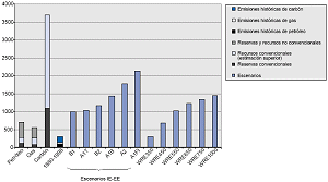 Figura RRP-2: Carbono en reservas y recursos de petróleo, gas y carbón en comparación con las emisiones históricas de carbono de combustibles fósiles entre 1860 y 1998, y con las emisiones de carbono acumulativas de una serie de escenarios IE-EE y de escenarios de estabilización del TIE hasta 2100. Los datos de las reservas y recursos se muestran en las columnas de la izquierda (Sección 3.8.2). Las fuentes no convencionales de petróleo y gas incluyen las arenas alquitranadas, el aceite de esquistos, otros hidrocarburos pesados, metano de lechos carboníferos, gas bajo presión geostática a gran profundidad, gas en acuíferos, etc. Los hidratos de gas (clatratos), que ascienden a una cifra estimada de 12.000GtC, no se indican en esta figura. Las columnas correspondientes a los escenarios comprenden escenarios de referencia del IE-EE así como escenarios que conducen a la estabilización de las concentraciones de CO2 en distintos niveles. Obsérvese que si para el año 2100 las emisiones acumuladas asociadas a los escenarios del IE-EE son iguales o menores a las de los escenarios de estabilización, ello no significa que estos escenarios también conduzcan a la estabilización. |
