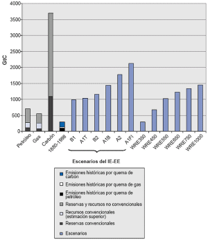 Figura RT-5: Carbono en reservas y recursos de petróleo, gas y carbón en comparación con las emisiones históricas de carbono provenientes de los combustibles de origen fósil entre 1860 y 1998, y con las emisiones acumuladas de carbono correspondientes a una serie de escenarios del IE-EE y de escenarios de estabilización del TIE hasta el año 2100. Los datos relativos a reservas y recursos se indican en las columnas de la izquierda. Las fuentes no convencionales de petróleo y gas incluyen las arenas alquitranadas, el aceite de esquistos, otros hidrocarburos pesados, metano de capas carboníferas, gas bajo presión geostática a gran profundidad, gas en acuíferos, etc. Los hidratos de gas (clatratos), que ascienden a una cifra estimada de 12.000 GtC, no se indican en esta figura. Las columnas correspondientes a los escenarios comprenden escenarios de referencia del IE-EE así como escenarios que conducen a la estabilización de las concentraciones de CO2 en distintos niveles.Obsérvese que si para el año 2100, las emisiones acumuladas asociadas a los escenarios del IE-EE son iguales o menores a las de los escenarios de estabilización, ello no significa que estos escenarios también conduzcan a la estabilización. |